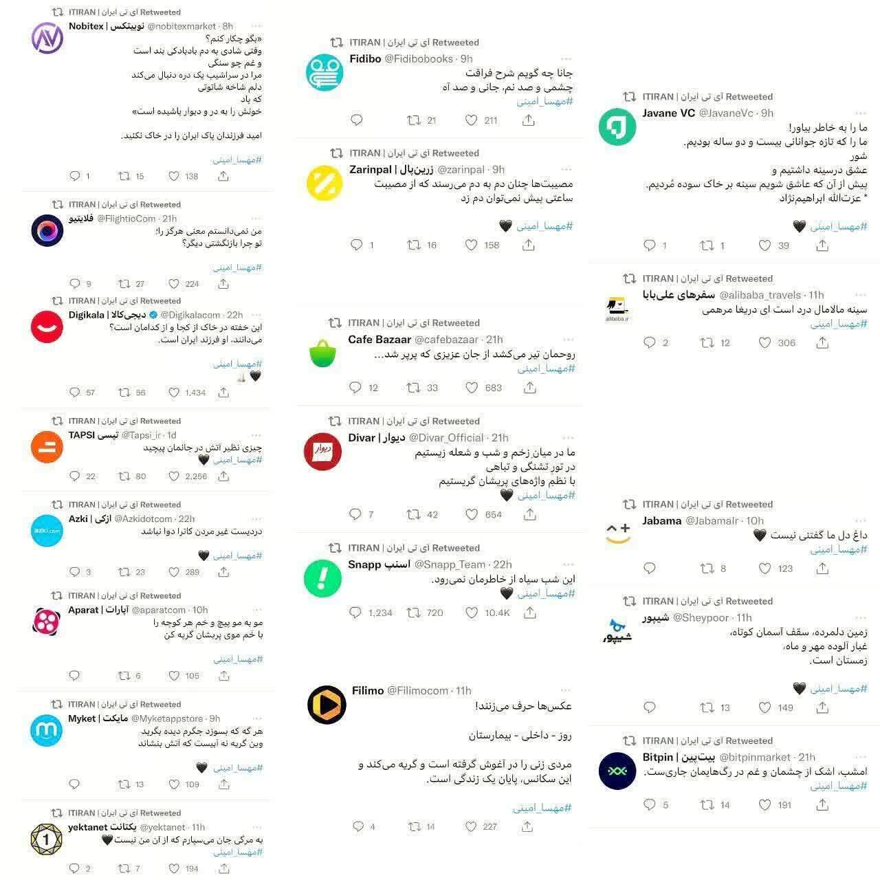 تمامی این شرکت ها که بیش از ۲۰ مورد را شامل می شوند فوت مرحومه مهسا امینی را هشتگ کردند که در این گزارش به بخشی از پیام هایی که در صفحات مجازی خود قرار دادند و اسناد آن نیز وجود دارد، اشاره خواهیم کرد؛ به عنوان مثال دیجی کالا آورده بود «این خفته در خاک از کجا و از کدامان است؟ می دانند او فرزند ایران است.».